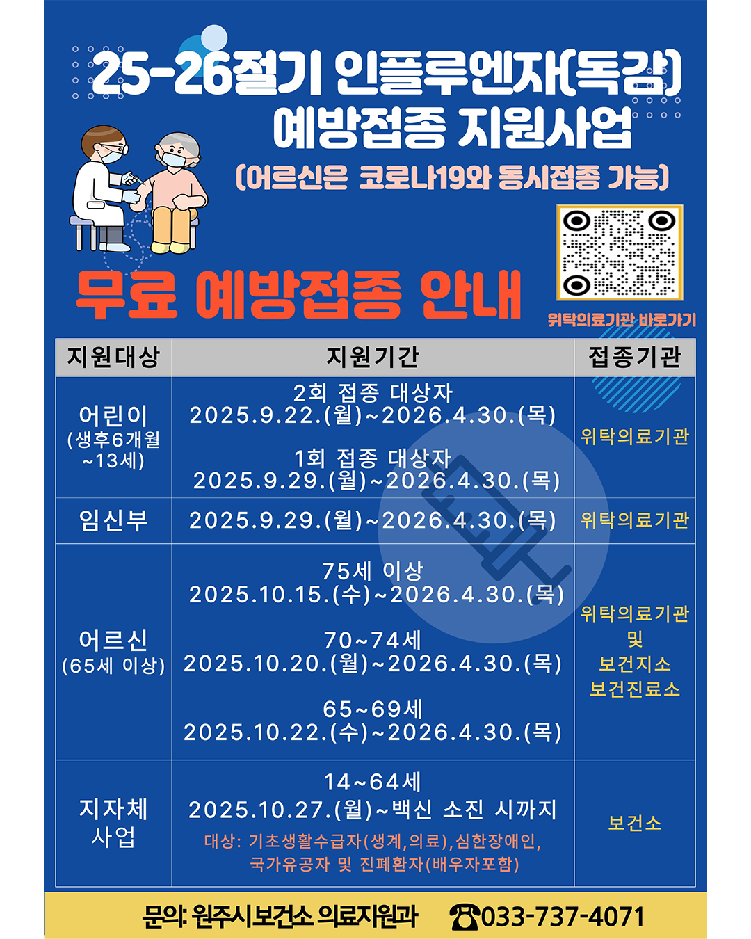 2025-2026절기 원주시 인플루엔자(독감) 국가예방 접종 일정 및 주요 내용은 아래와 같습니다.