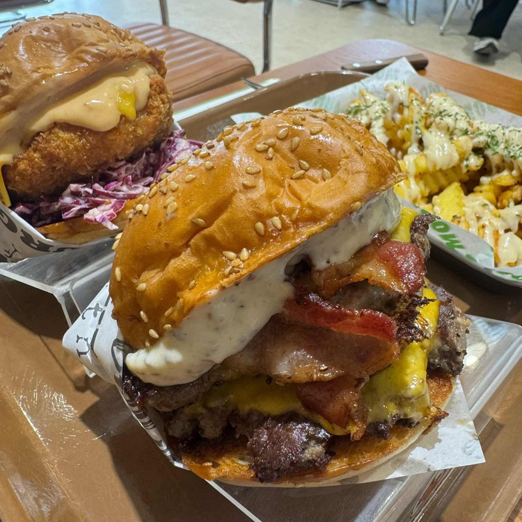 이 버거는 두 개의 두꺼운 소고기 패티와 녹아내린 치즈, 바삭한 베이컨이 조화를 이루어 정말 맛있습니다