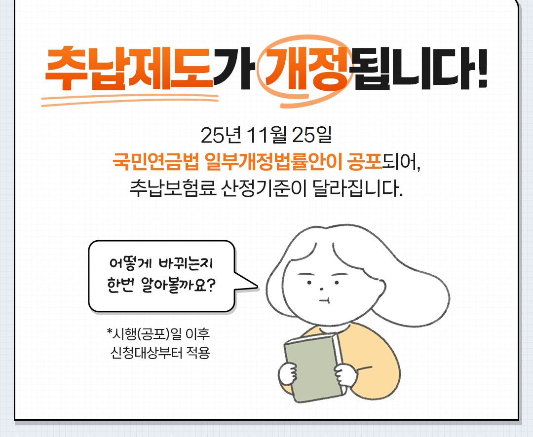 2025년 11월 25일에 국민연금공단과 국민연금법 개정으로, 추납제도(추후 납부 제도)에 다음과 같은 주요 변경사항이 생겼습니다.