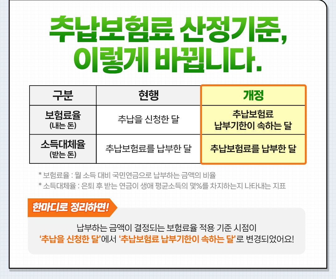 - 기존: “추납 신청한 날이 속하는 달”의 보험료율을 기준으로 삼음.