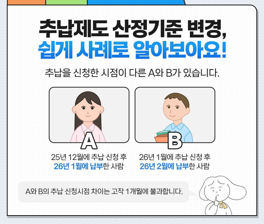 - 그러나 개정 전 방식대로라면, 예를 들어 2025년 12월에 추납 신청하고 2026년 1월에 납부하는 경우,