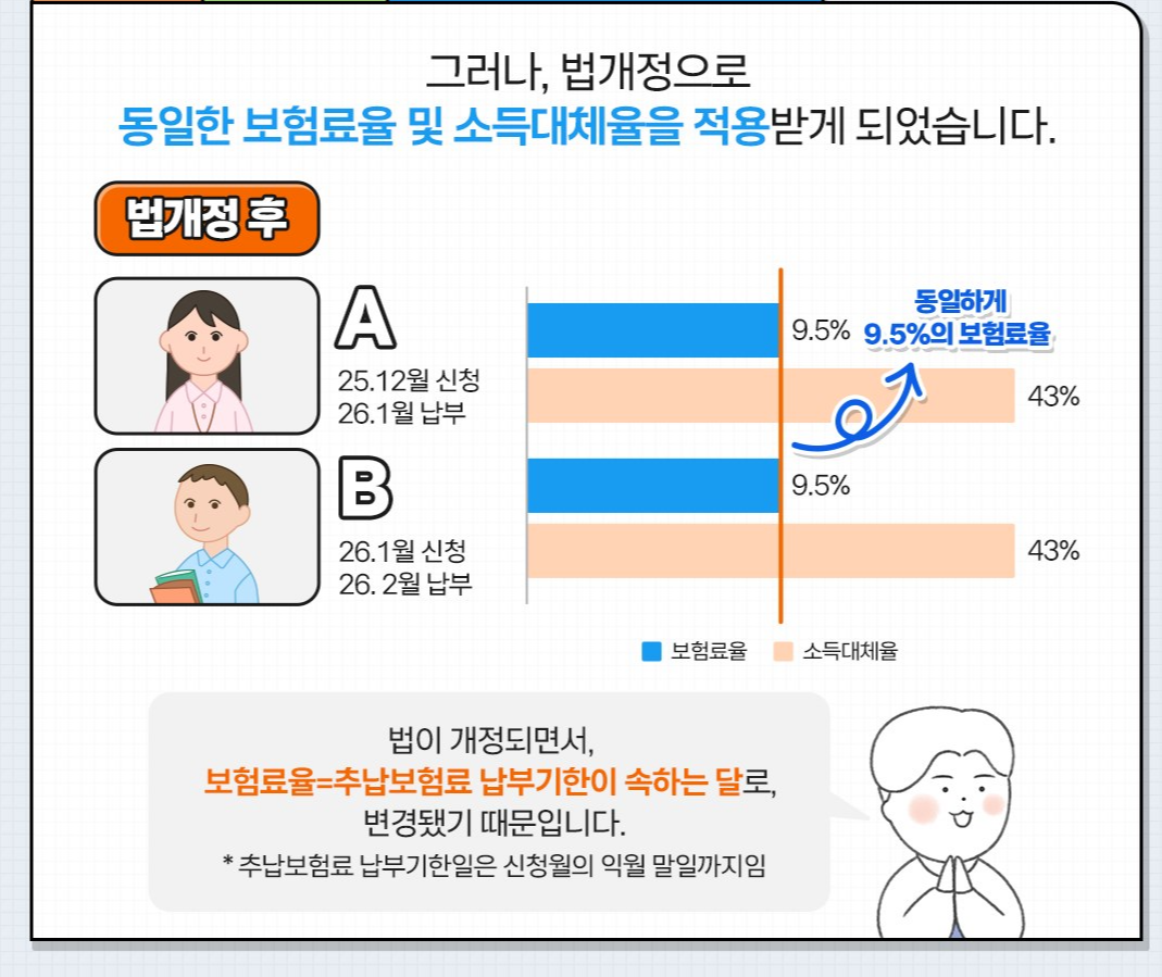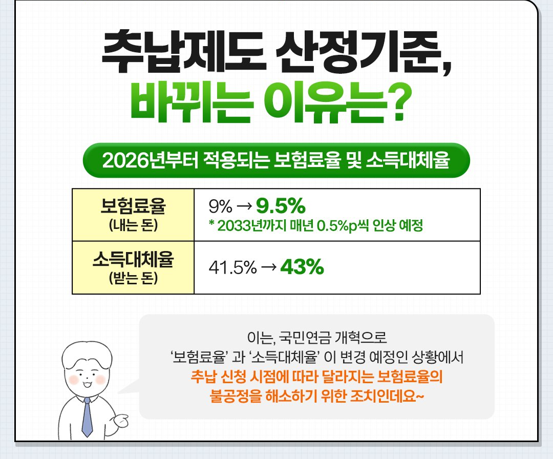 → 예전처럼 “신청 월 잘 맞추면 유리”했던 이른바 ‘꼼수’ 같은 상황이 사라짐 - 2026년 이후 보험료율과 소득대체율 모두 인상 예정이라, 추납 시기와 무관하게 동일 기준 적용 → 가입자 간 형평성 확보