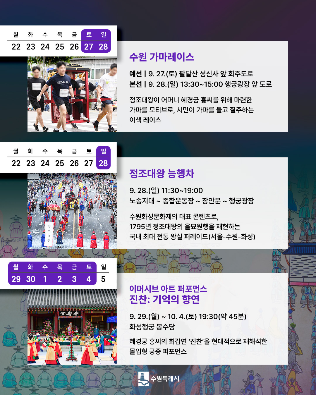 - 수원 가마레이스: 정조대왕의 가마를 모티브로 한 이색 달리기 대회로, 예선은 9월 27일(토) 팔달산 회주도로에서, 결선은 9월 28일(일) 수원화성행궁 앞 도로에서 열립니다.