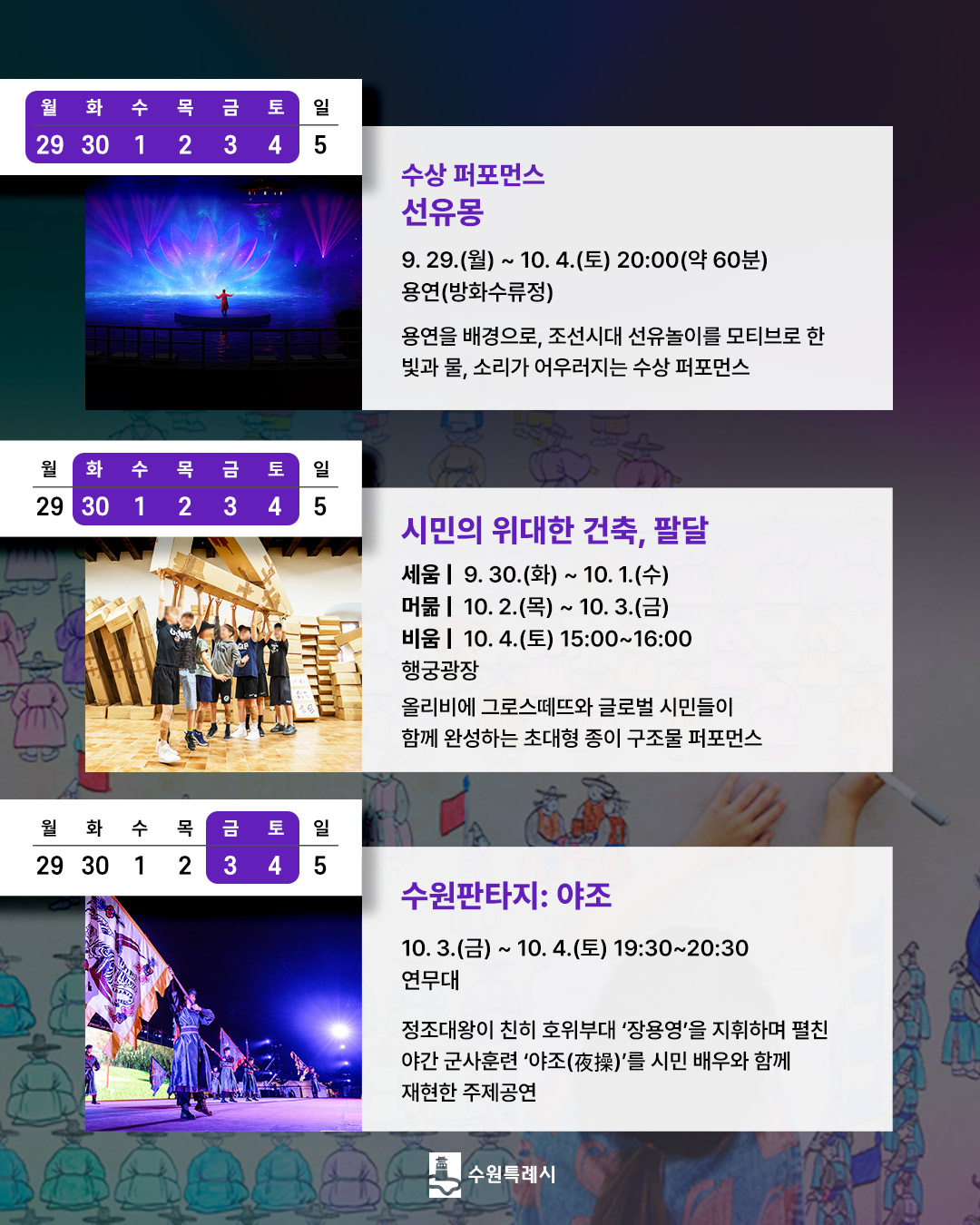 - 주제공연: '수원판타지: 야조' – 전통과 현대를 아우르는 대형 공연으로, 연무대와 행궁광장에서 10월 3일(토)~4일(일)에 진행됩니다.