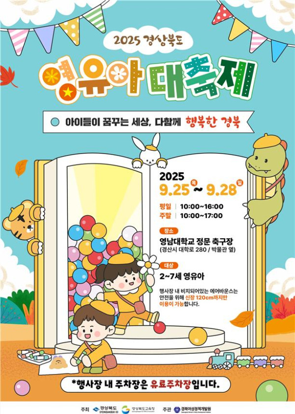 2025년 경상북도 영유아대축제는 경북교육청과 경북도가 공동으로 주최하며, 9월 25일부터 28일까지 영남대학교 경산캠퍼스에서 개최됩니다.