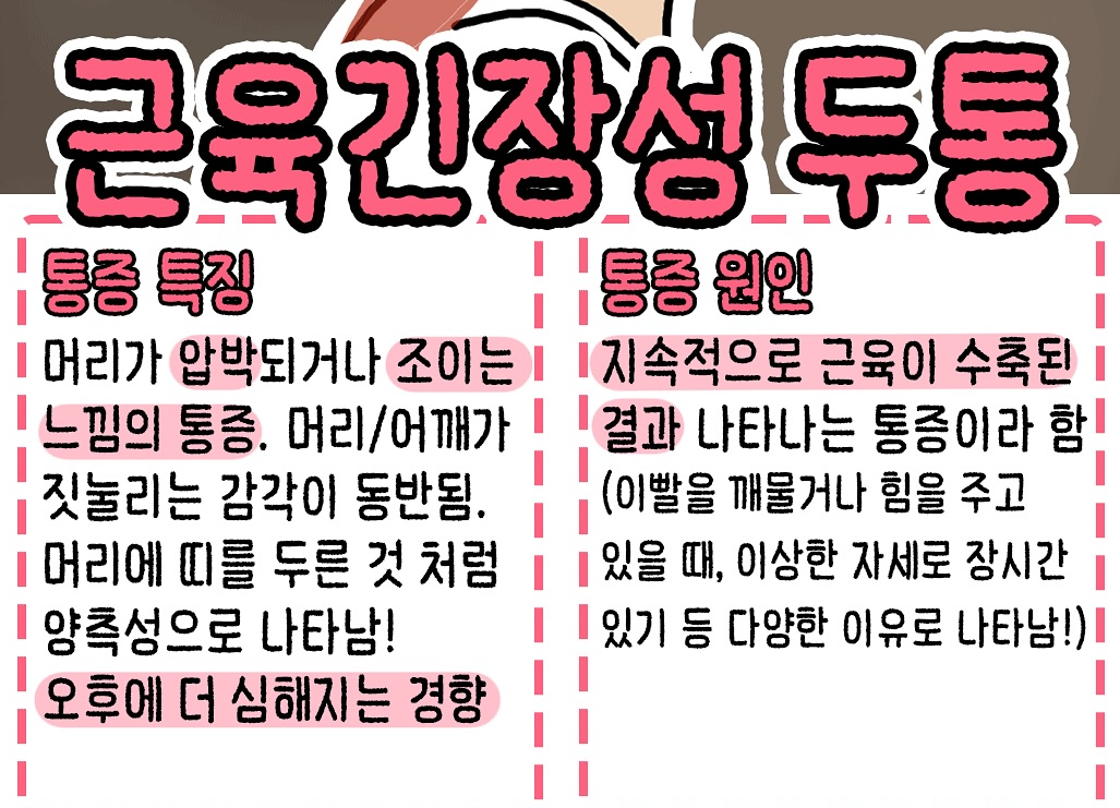 근육 긴장성 두통은 가장 흔한 형태의 두통 중 하나로, 주로 목, 머리, 어깨 주변 근육의 긴장이나 스트레스와 관련되어 발생합니다.