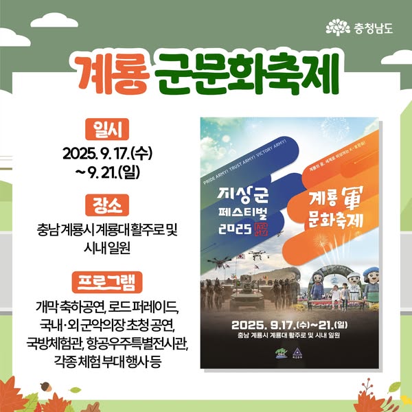 계룡 군문화축제(계룡軍문화축제)는 국방수도 계룡에서 펼쳐지는 역동적인 군(軍) 문화와 체험이 어우러진 대표 축제입니다.