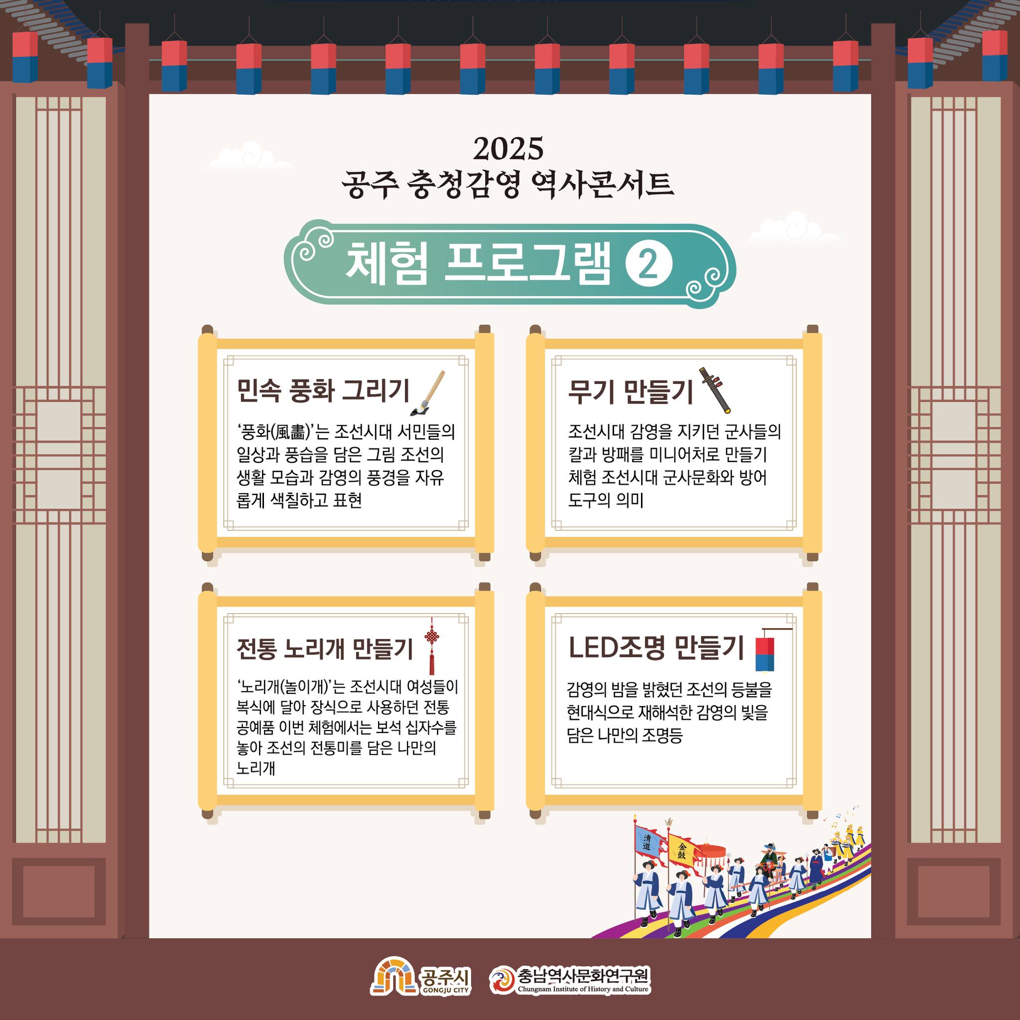 캘리그라피 호패·실크스크린 가방·제비연·페이스페인팅·갓키링·측우기·민속풍화·무기·노리개·LED조명 만들기 등