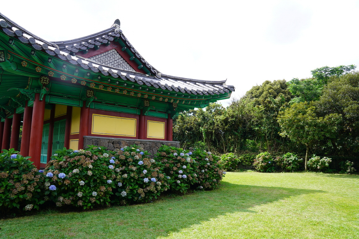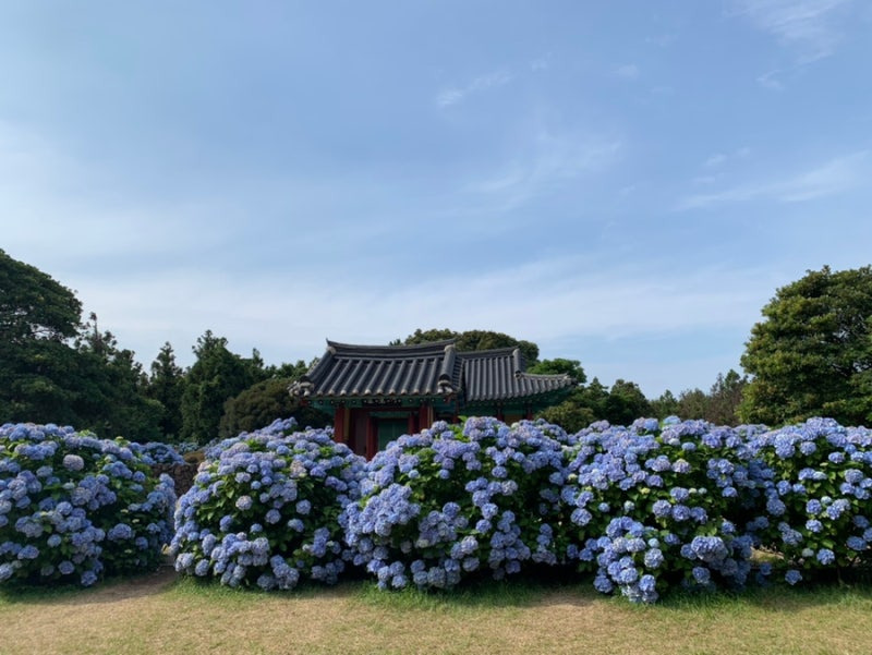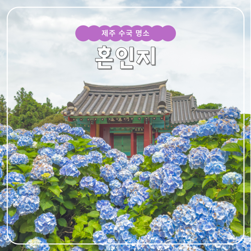 혼인지 제주는 제주도 동쪽에 위치한 아름다운 관광 명소로, 푸른 수국과 전통 건축물의 조화가 특히 매력적입니다.