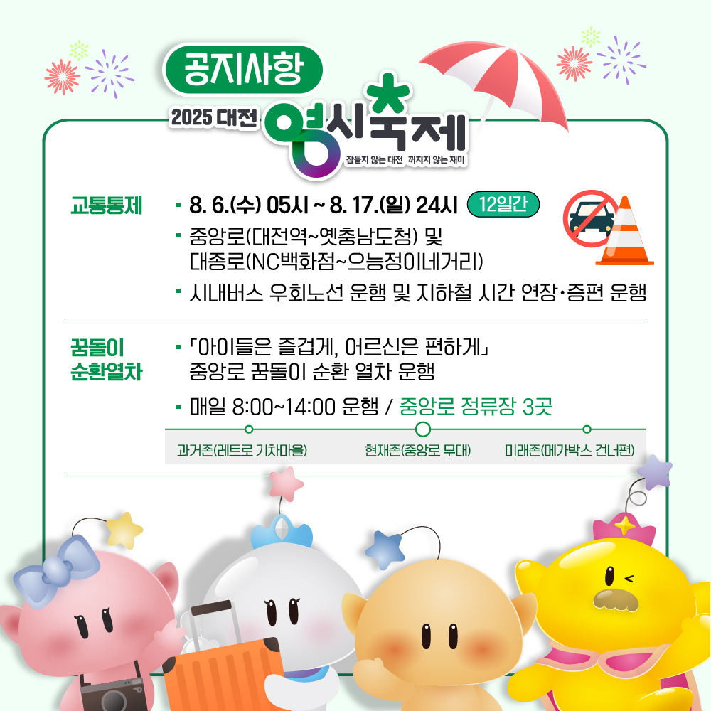 - 장소: 대전역부터 옛 충남도청사 앞 중앙로 1km 구간 일대, 축제 기간 동안 차량 전면 통제