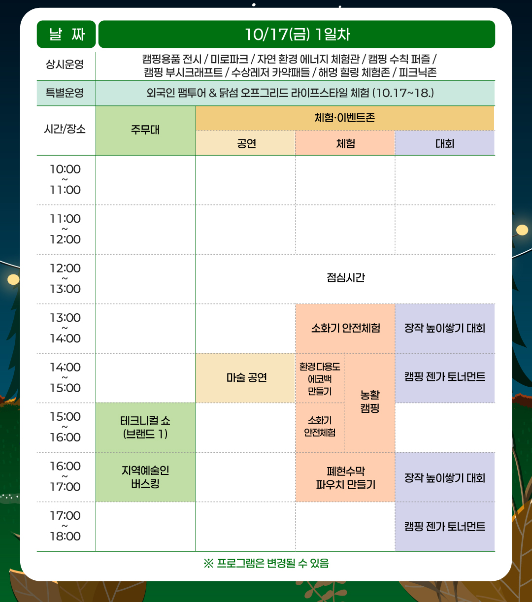 - 체험 프로그램: 캠핑용품 DIY, 바비큐 체험, 밀키트 체험, 농활 체험, 세계 캠핑 문화 체험 등 다양한 활동 계획중