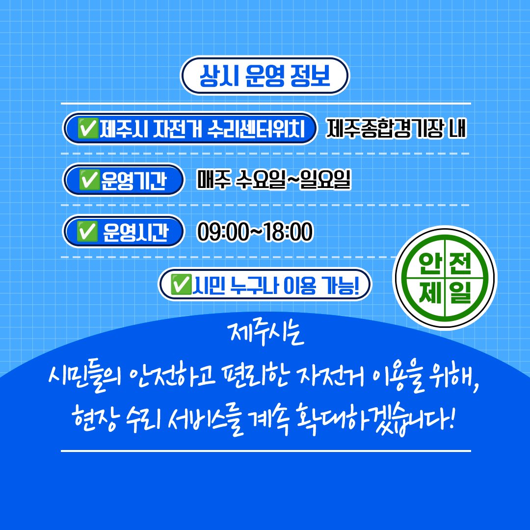 | 고정 수리센터 | 제주종합경기장 | 연중 | 수~일 9:00–18:00 | 상시 점검 및 수리 |