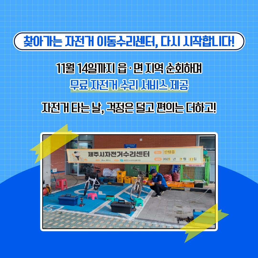제주시는 하반기(2025년 7월~11월 14일) 동안 **읍·면 순회 ‘찾아가는 자전거 이동수리센터’**를 운영합니다.