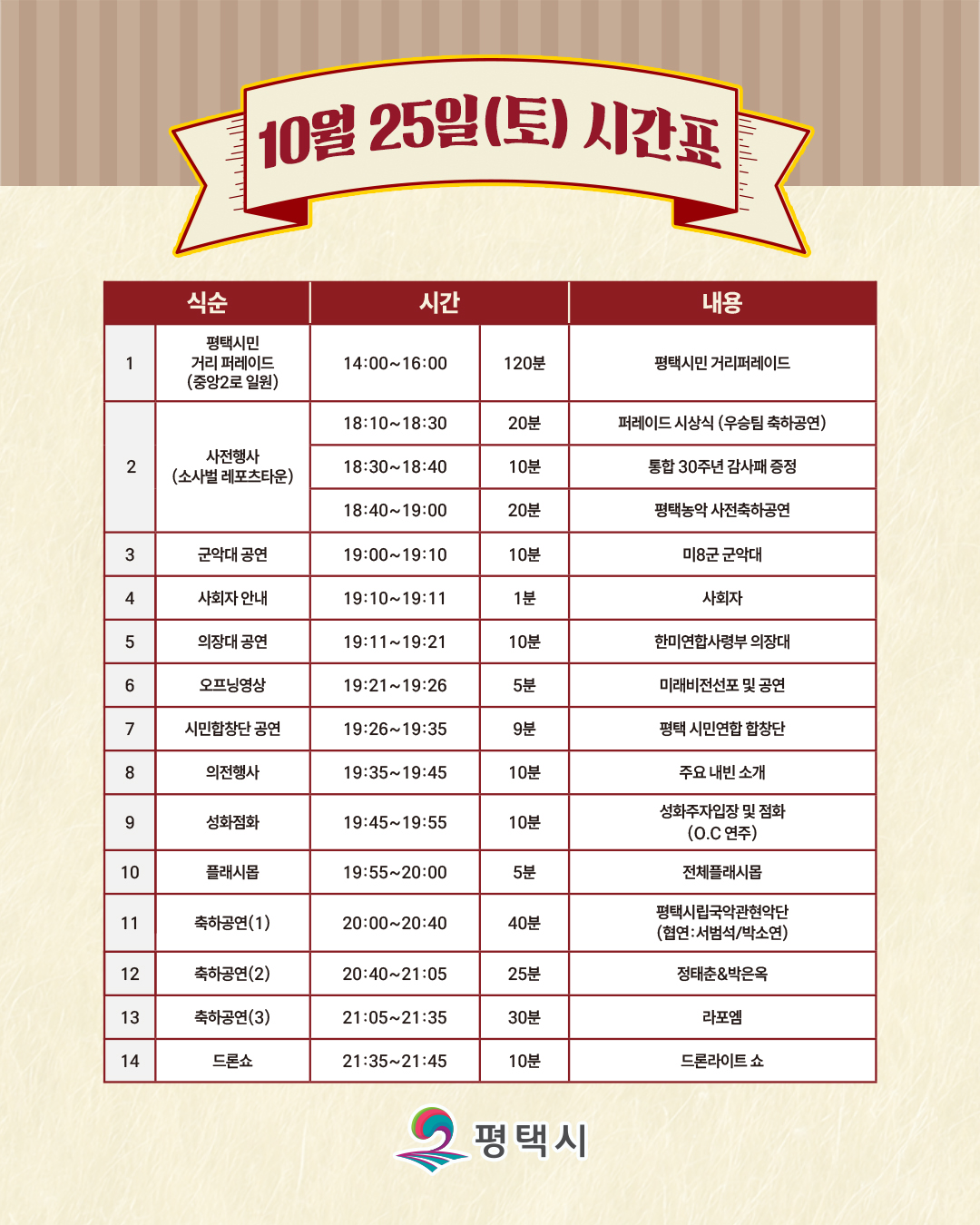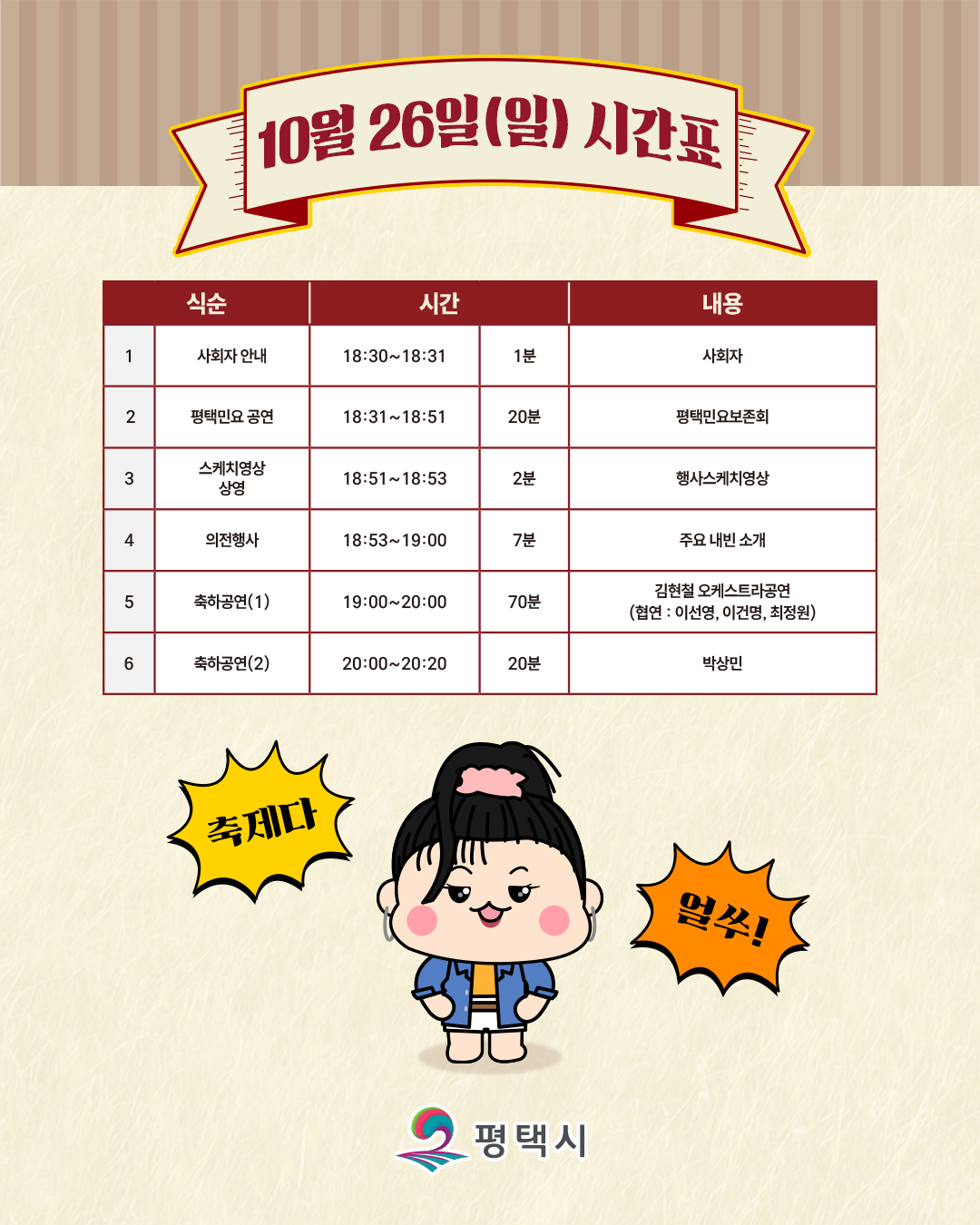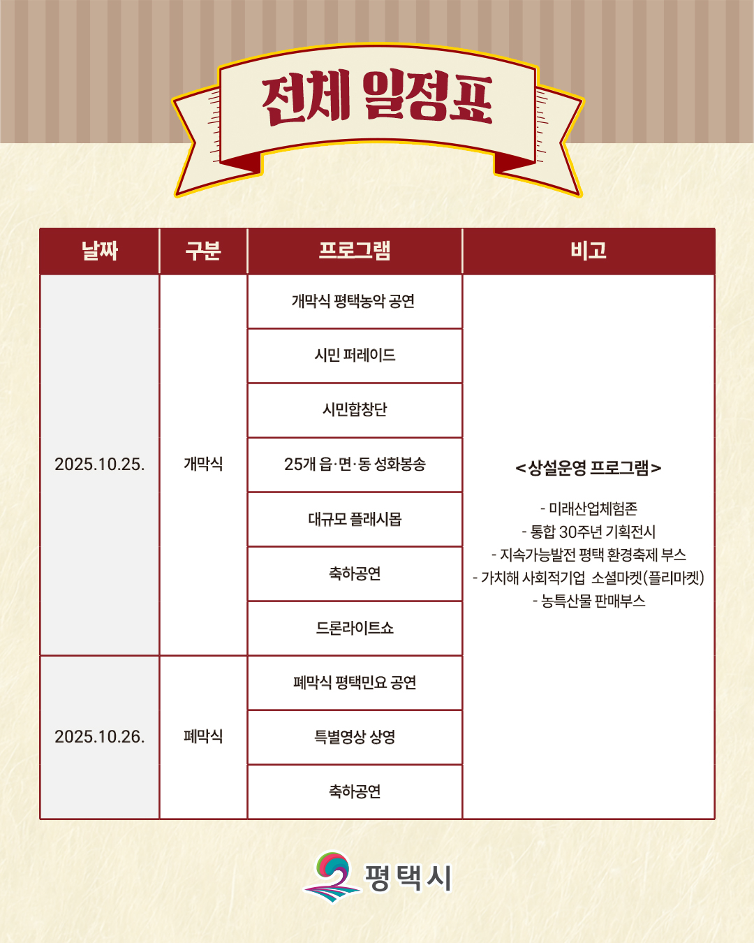 자세한 일정과 프로그램은 평택시 공식 SNS 채널을 통해 확인하실 수 있습니다.