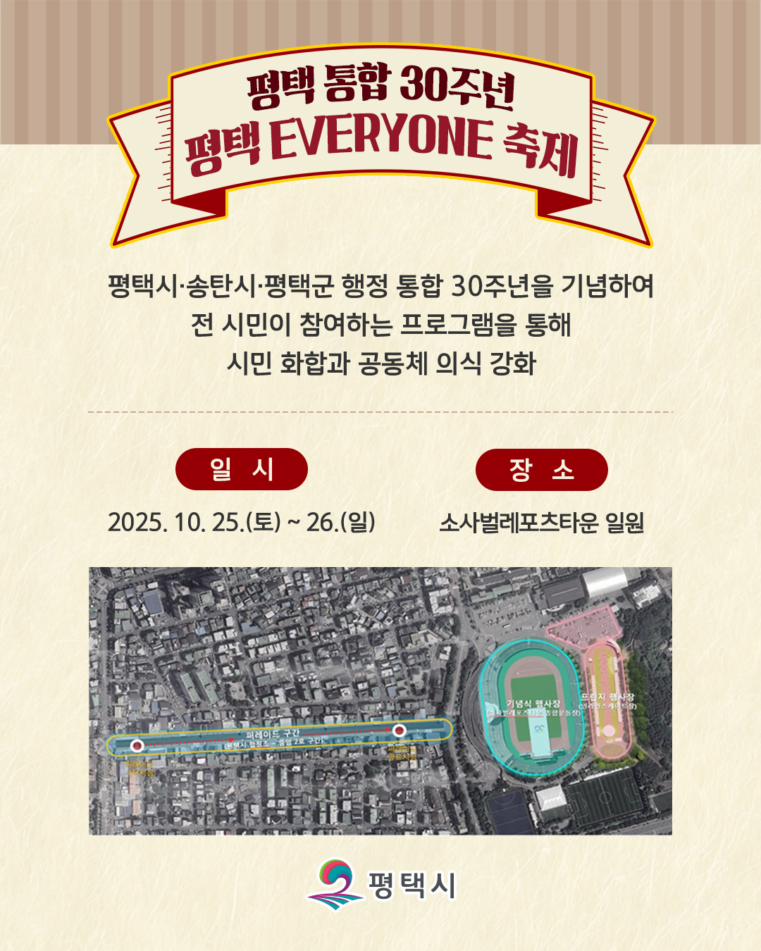 평택시는 2025년 10월 24일부터 26일까지 소사벌레포츠타운 일원에서 '평택 EVERYONE 축제'를 개최합니다.