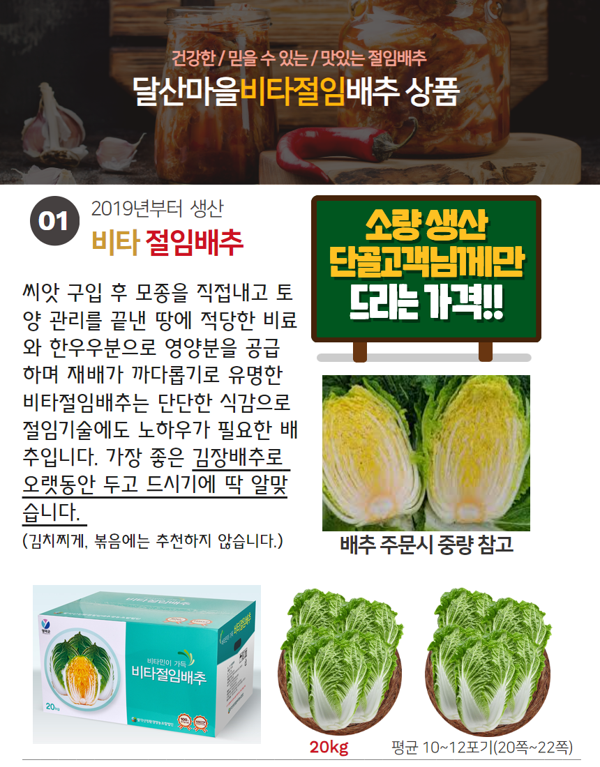 절임배추를 잘 보관하고 활용하는 방법에 대해 알아보았습니다. 절임배추는 한국의 대표적인 저장 식품으로, 올바른 관리만 한다면 오랜 시간 동안 맛있게 즐길 수 있습니다. 추천드리는 절임배추 제품으로는 "비타 절임배추"가 있습니다.