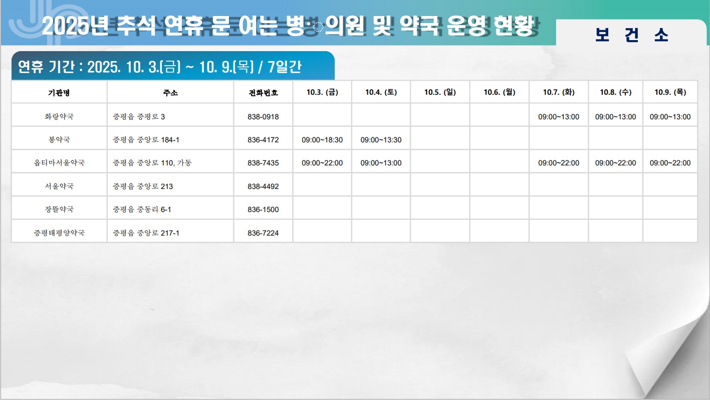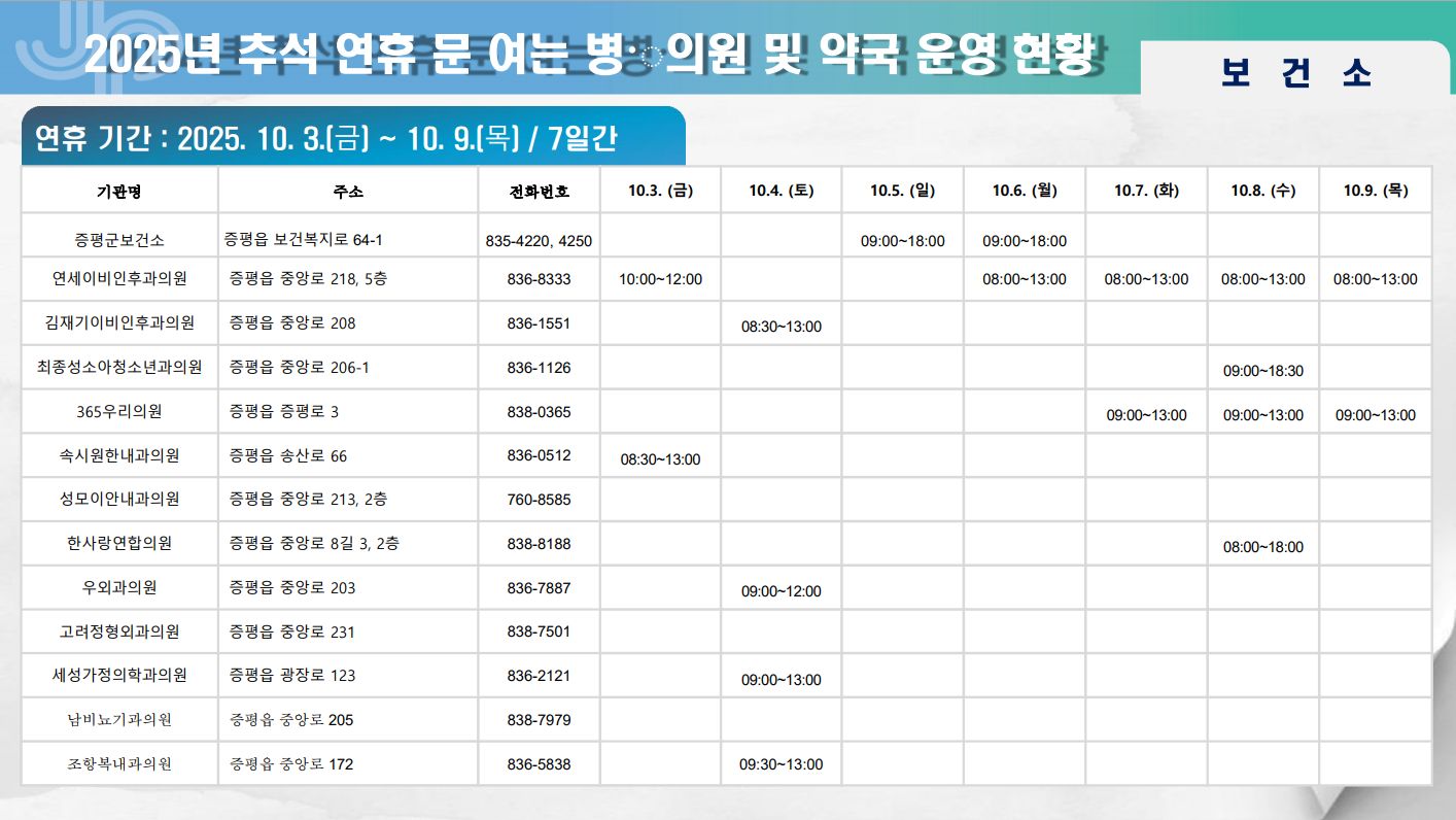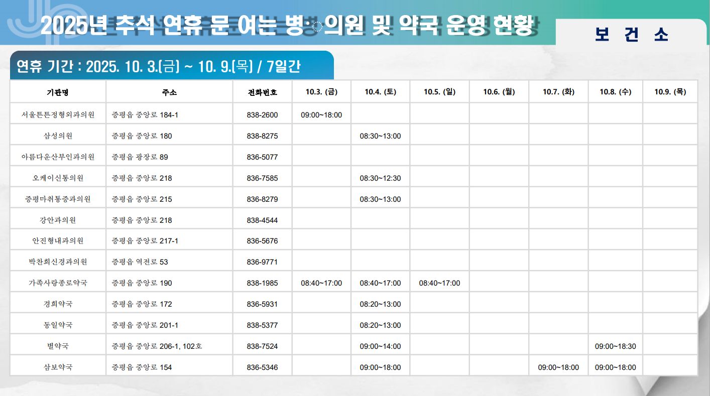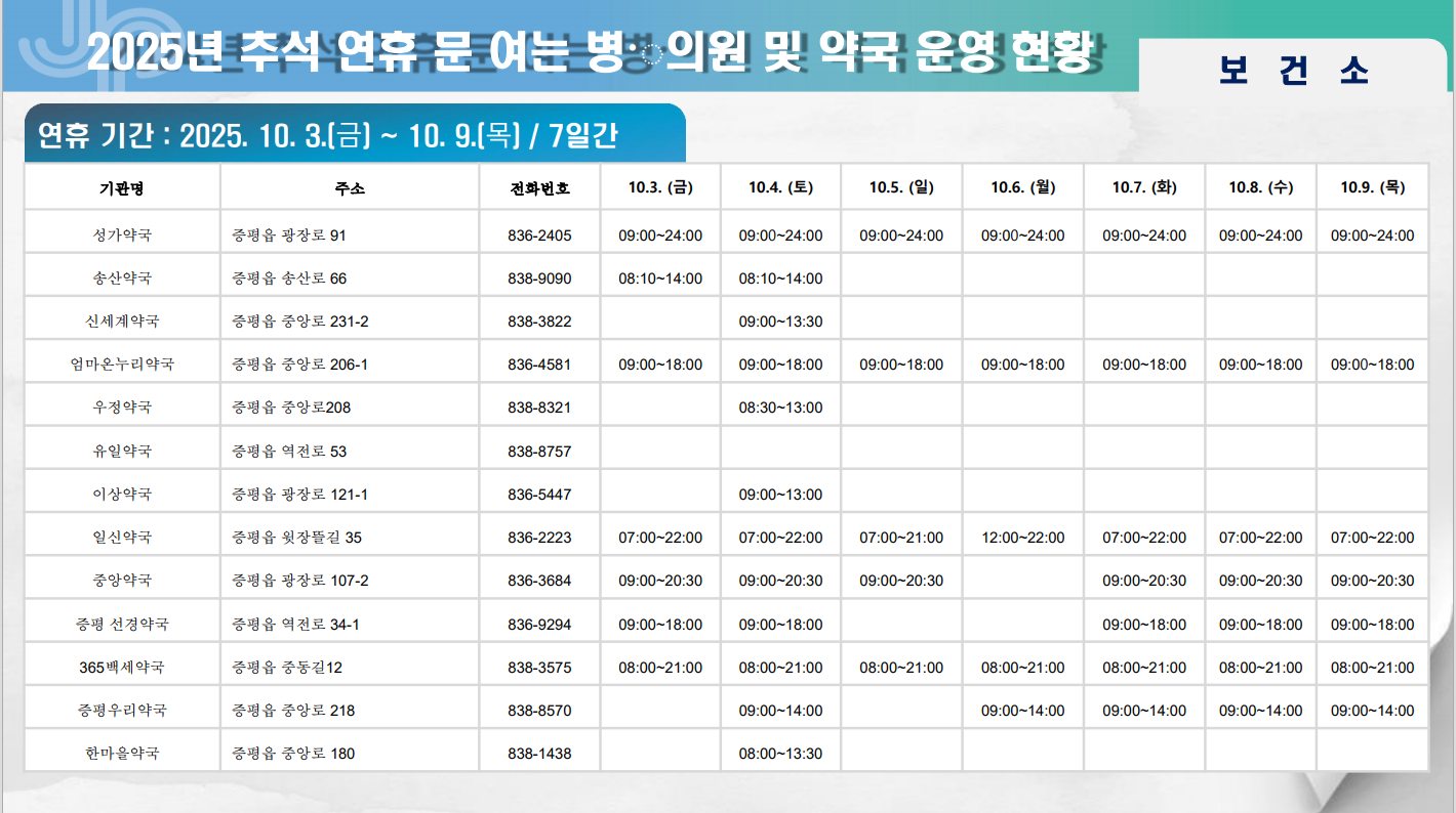 2025년 증평군 추석 연휴 문여는 의료기관 및 약국 운영 현황을 안내해 드립니다.