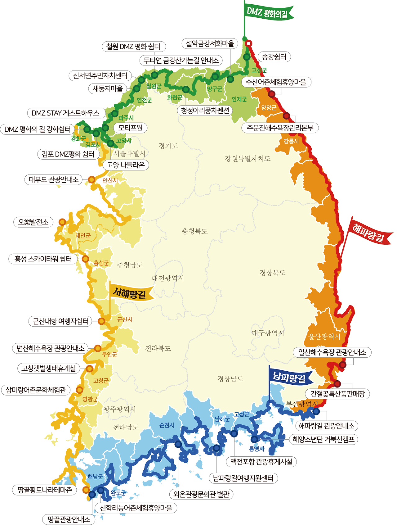 코리아 둘레길은 크게 DMZ 평화길, 서해안길, 남해안길 등으로 나뉘어져 있습니다.