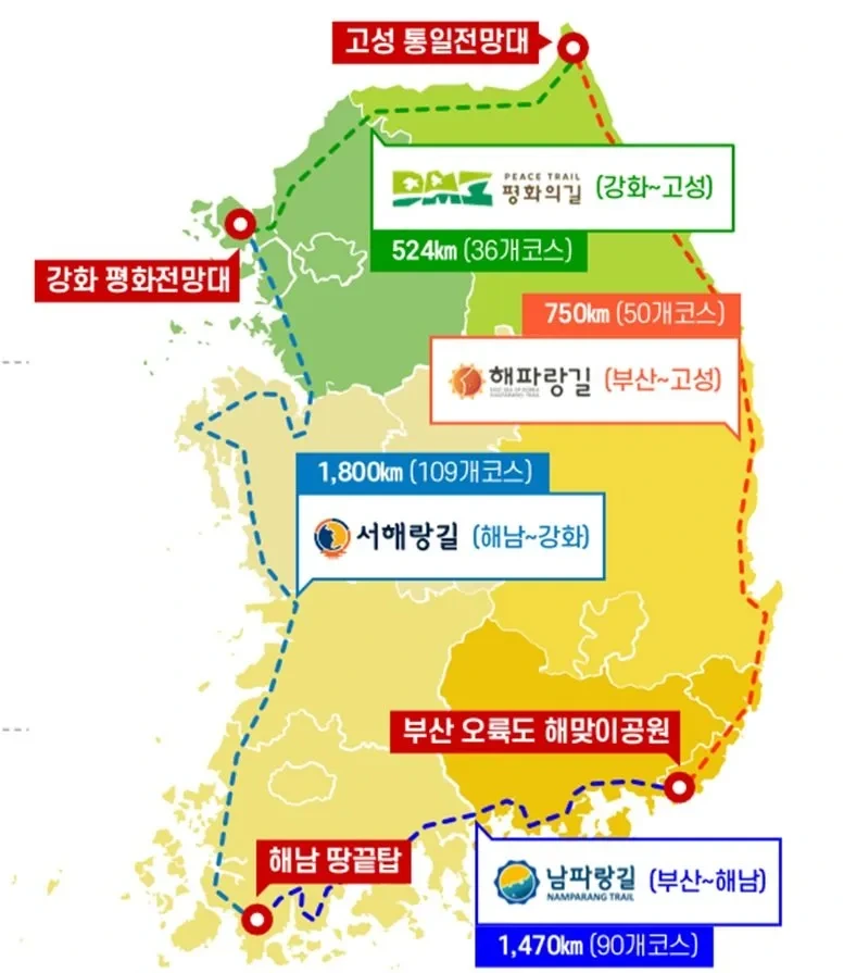 - DMZ 평화길 : 이 경로는 북한과의 경계선 근처를 따라 이어지며, 그 자체로 역사적 의미를 지니고 있습니다. 이 길은 약 750km로 구성되어 있으며, 아름다운 자연경관과 함께 역사적인 장소들을 방문할 수 있습니다.