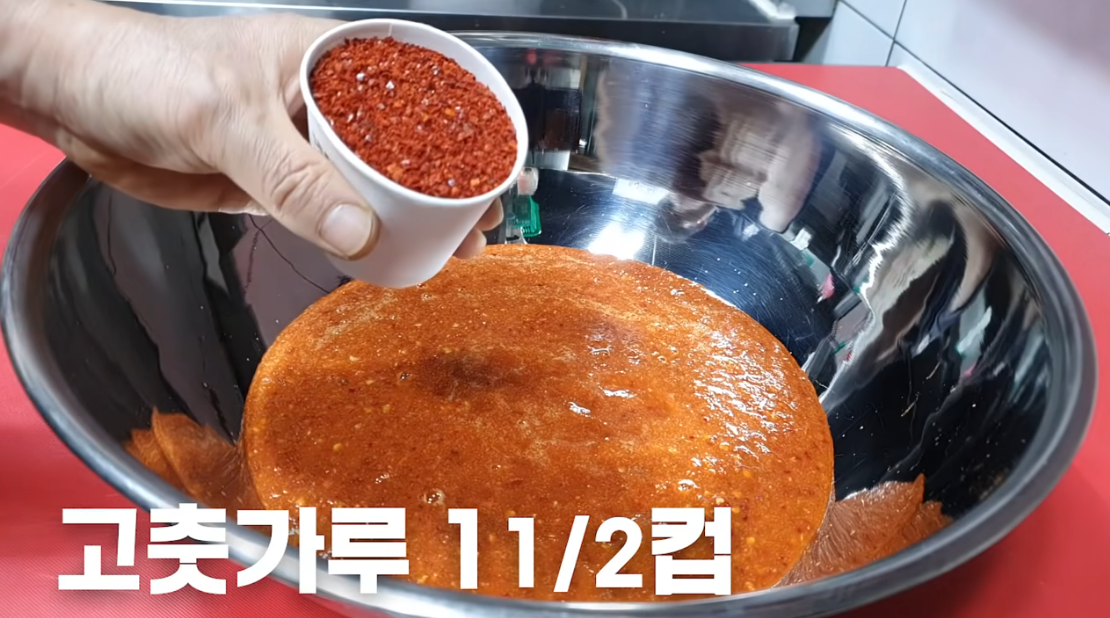 믹서기에 간 것에 고춧가루 1컵+1/2컵을 넣어줍니다.