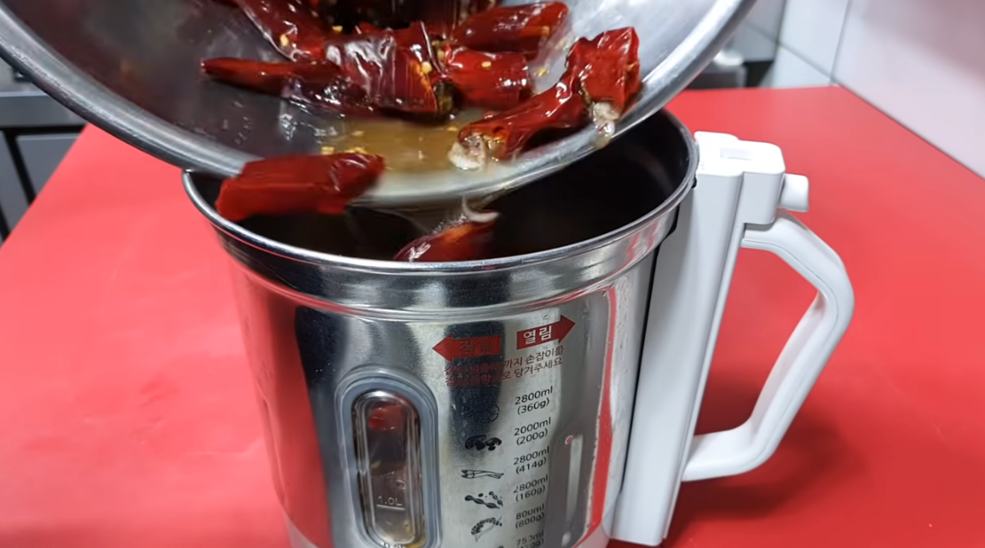 아까 불려둔 건고추물을 넣어주고 믹서기에 다 같이 갈아줍니다.