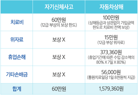 일반적인 자기 신체 사고와 자동차 상해의 혜택 범위입니다.