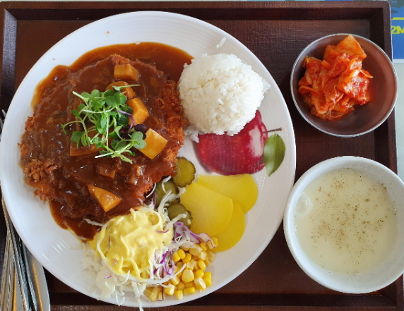 사과로 유명한 충주의 특산품, 사과 엑시스로 만든 수제 돈까스로 일반적으로 올라가는 파인애플을 대신해서 사과가 올라간다고 하네요.