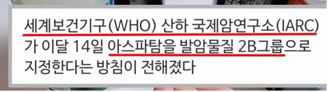 거기다가 최근에 WHO에서 아스파탐을 발암물질로 분류할 예정이라는 이야기 때문에 이슈가 되었습니다.