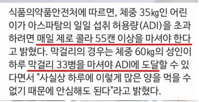 체중 35kg의 어린아이조차도 일일섭취허용량을 초과해서 아스파탐을 먹으려면 제로콜라 55캔을 먹어야하고, 60kg이상의 성인도 막걸리를 하루에 33병을 먹어야 기준치를 초과한다고 합니다.