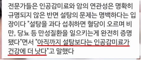 믿거나 말거나, 어쨌든 팩트로 봤을 때, 그리고 전문가들의 의견으로 봤을 때에도 현재 인공감미료보다는 설탕쪽이 훨씬 몸에 안좋다는 것 기억해주시면 되겠습니다.