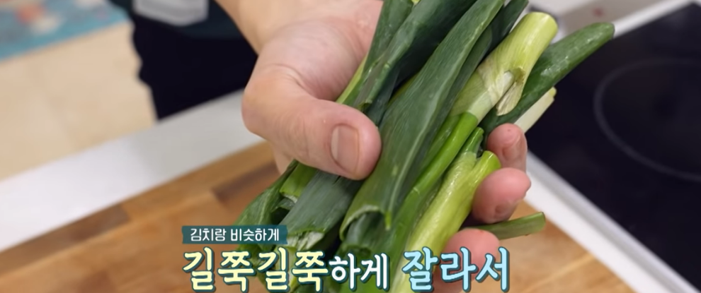 김치랑 비슷하게 길쭉길쭉하게 자른 대파와 통마늘을 넣어줍니다.