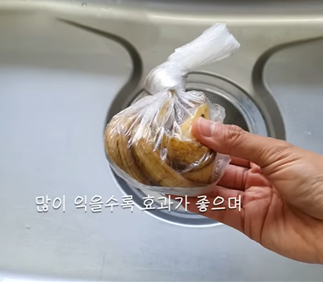 이렇게 껍질을 넣고 입구 부분을 랩으로 두 번 감싸주고 입구 부분을 고무줄로 완전 봉쇄해 줍니다.