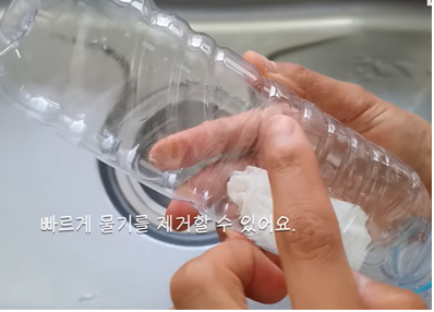 거꾸로 세워서 말려도 되지만 키친타올 한 장을 넣어서 흔들어주면 페트병안의 물기가 빠르고 잘 마릅니다.