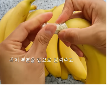 드실만큼만 실온에 위와 같이 보관하고 나머지는 꼭지를 잘라서 바나나 전체를 랩으로 감싸줍니다.