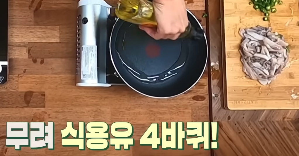 4. 팬에 식용유는 4바퀴, 그리고 참기름 1스푼을 섞어 풍미를 올려줍니다.
