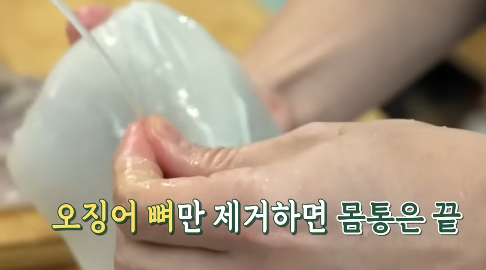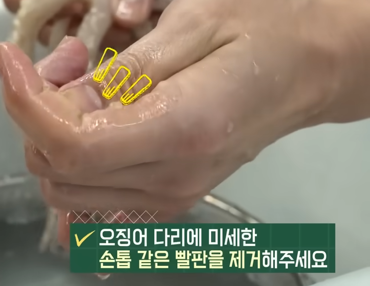1. 오징어는 깨끗하게 씻은 후, 몸통은 내장과 오징어뼈를 제거하고 다리는 손으로 훑어가며 빨판을 제거해줍니다.