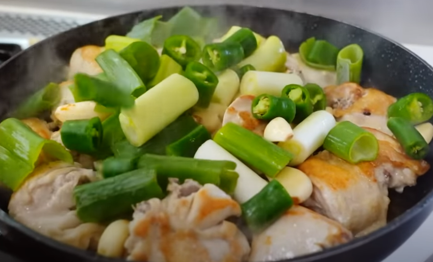 닭볶음당용 닭 1kg, 소금 3꼬집, 통마늘, 대파, 고추