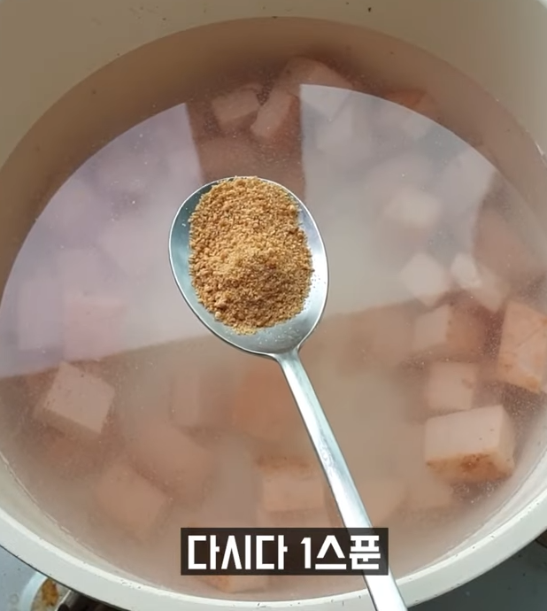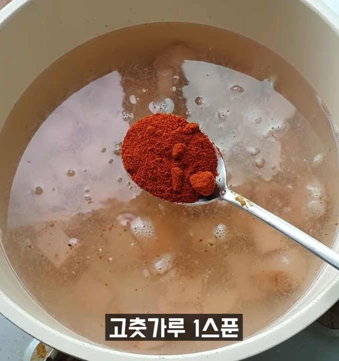 7. 다시다 1스푼, 된장 1스푼 반, 고춧가루 1스푼을 넣어줍니다.
