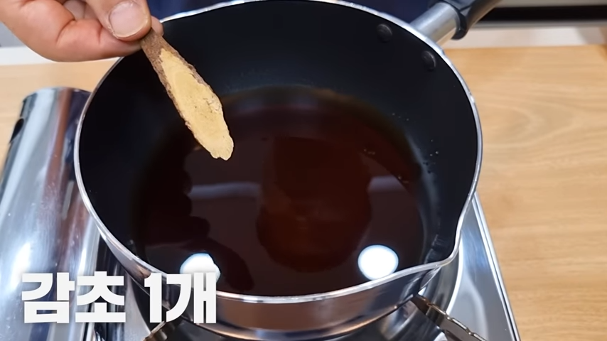 물 한 컵 반(300ml), 진간장 반 컵, 감초 1개, 건고추1개, 물엿 1/3컵을 넣습니다.