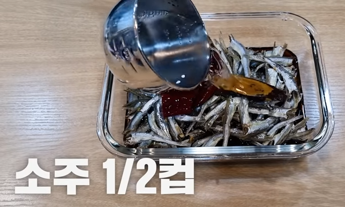 멸치위에 식힌 간장물을 부은 뒤, 소주 1/2컵, 식초 1스푼을 넣고 멸치장아찌를 완성합니다.
