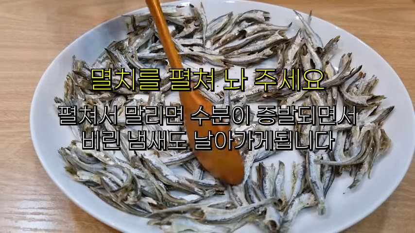 전자레인지로 돌린 멸치를 접시에 펼쳐서 말리면 수분이 증발되면서 비린내도 날아갑니다.