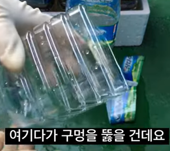 스티로폼안에 물을 부어주면 패트병의 구멍난 곳으로 물이 자동으로 들어가게 됩니다.