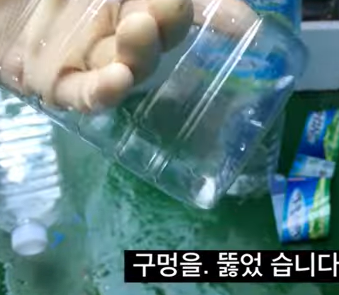 페트병의 뚜껑이 잠길 정도로 물을 부어줍니다.