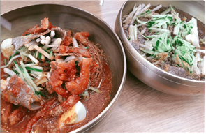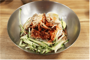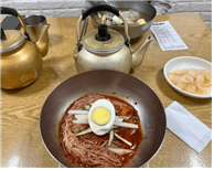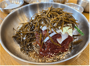 다른 지방에서는 보기 드물게 명태식회가 올려진 비빔냉면이 일품인 달인의 노하우가 듬뿍 담긴 냉면이라고 합니다.